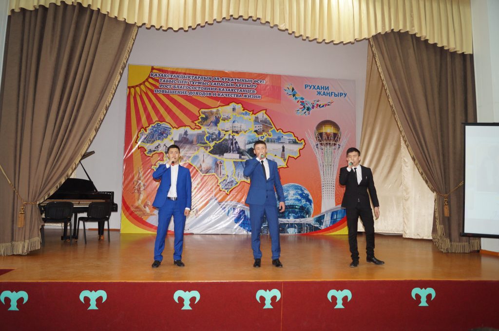 В рекреации колледжа была организована презентация специальностей, а в актовом зале – праздничный концерт. Агитбригада «Бір қадам алға» и педагогический отряд «Жигер» показали учащимся школ преимущества обучения в гуманитарном колледже им. М.Жумабаева. Номера художественной самодеятельности ярко демонстрировали способности студентов, работу кружков и клубов. Гости получили подробную информацию о тех профессиях, которым обучают в колледже.