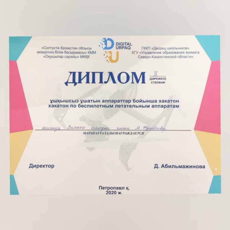 Ұшқышсыз ұшатын аппараттар бойынша хакатонда жүлделі ІІІ орын алған Мағжан Жұмабаев атындағы жоғары колледж командасын құттықтаймыз. Жетекші Хаиржанов Азамат Акылбекович.