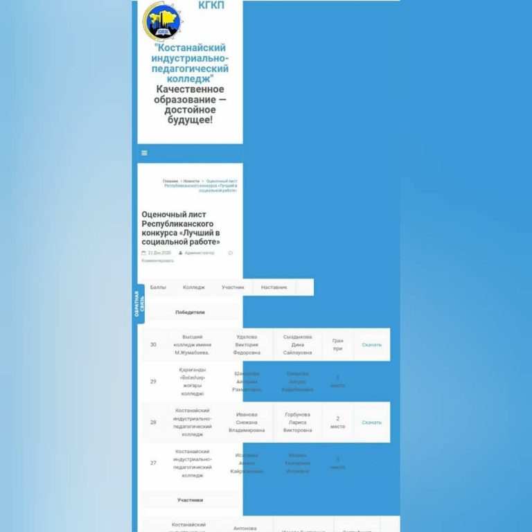 Қостанай индустриалды педагогикалық колледжіндегі “Әлеуметтік жұмыс” ОӘБмен 2020 ж. 25 қараша-3 желтоқсан аралығында “Әлеуметтік жұмыстағы үздік” республикалық сайысы ұйымдастырылып өткізілді.