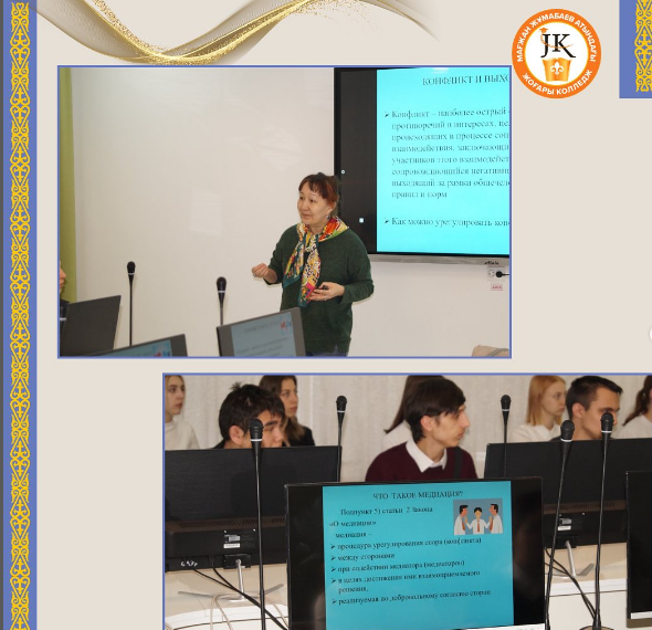 2024 жылдың 27 ақпанында М.Жұмабаев атындағы жоғары колледжде «Қоғамдық келісім» КММ этномедиация бойынша жетекші сарапшысы И.Қуановамен этносаралық жанжалдардың алдын алу және этномедиация туралы іс-шара өтті. Әңгіме барысында этносаралық қақтығыс ұғымы, оның пайда болу себептері, сондай-ақ қоғам үшін салдары сияқты түрлі тақырыптар қозғалды. Студент сұрақ қойып, болашақта кездесетін нақты жағдайларды талқылады. Осы тақырыпты әрі қарай зерттеуге және этникалық медиацияны кәсіби қызметінде қолдану мүмкіндігіне қызығушылық танытты.
