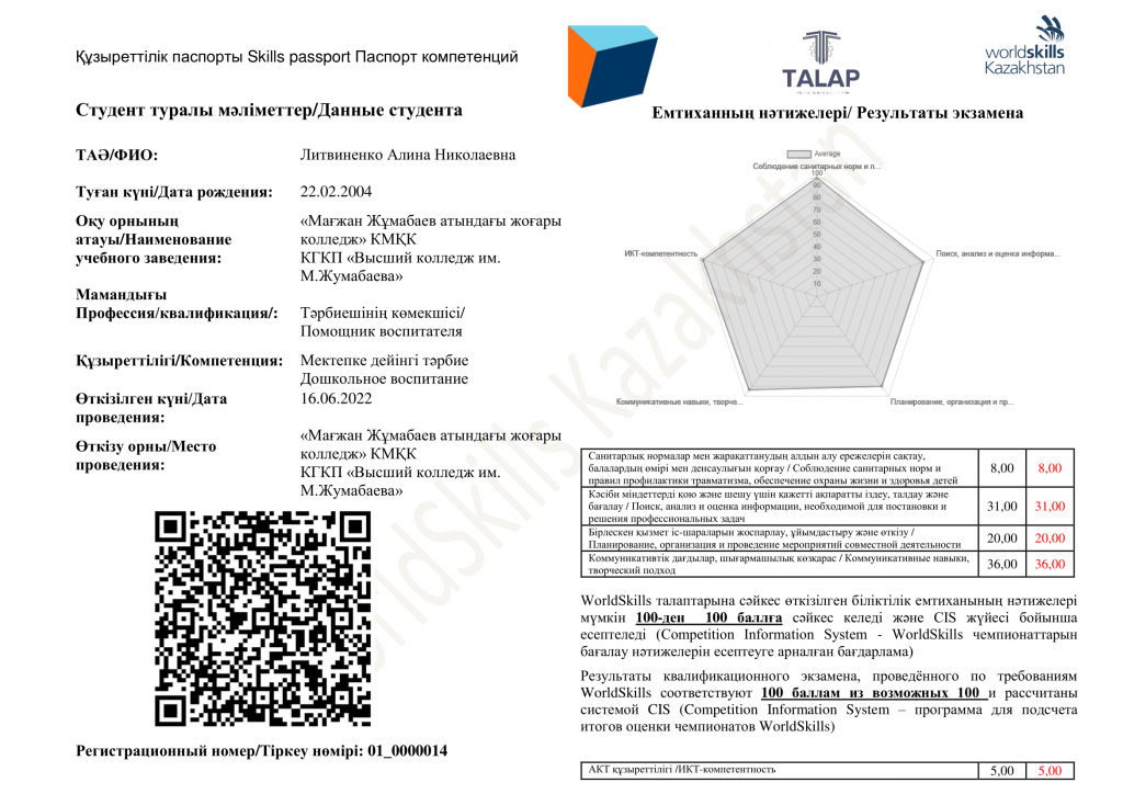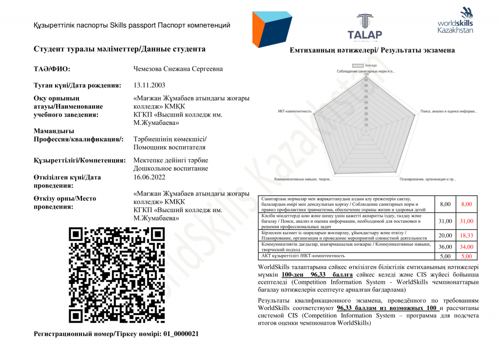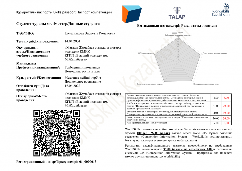 Мамандық: 01120100 – Дошкольное воспитание и обучение. Біліктілік: 3W01120101 (код в МСКО 0112, код в НКЗ РК 5311-2) - Помощник воспитателя