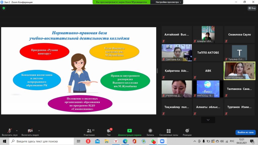 4 февраля 2021 года преподаватель педагогики, психологии и самопознания Мухамадиева А.Д. приняла участие в Республиканских педагогических чтениях «Педагогика любви и творчества» для организаций технического и профессионального образования. Чтения проводились через платформу ZOOM, а также велась прямая трансляция по Facebook. Тема выступления «Интеграция идей самопознания в общепрофессиональные дисциплины». Общее количество участников – более 500 человек.